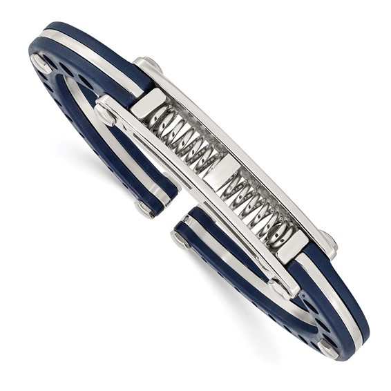 This men's blue-plated stainless steel bangle bracelet has hinges. 1/4in wide bangle bracelet with blue PVC. This bracelet is composed of grade 316 stainless steel, known for its superior corrosion resistance. 316 steel is commonly used in stainless steel jewelry. Insist on 316 stainless steel. 316 steel is also known as marine grade stainless steel, for its high resistance to chloride corrosion. Stainless steel will not oxidize [rust] nor turn black. Imported.