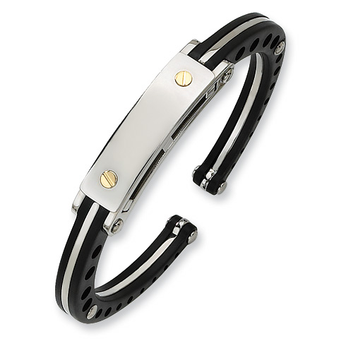 Polished finish. 1/4in wide bangle bracelet with black PVC. Plate is 3/8in wide and features two 18k yellow gold accents. This bracelet is composed of grade 316 stainless steel, known for its superior corrosion resistance. 316 steel is commonly used in stainless steel jewelry. Insist on 316 stainless steel. 316 steel is also known as marine grade stainless steel, for its high resistance to chloride corrosion. Stainless steel will not oxidize [rust] nor turn black. Imported.