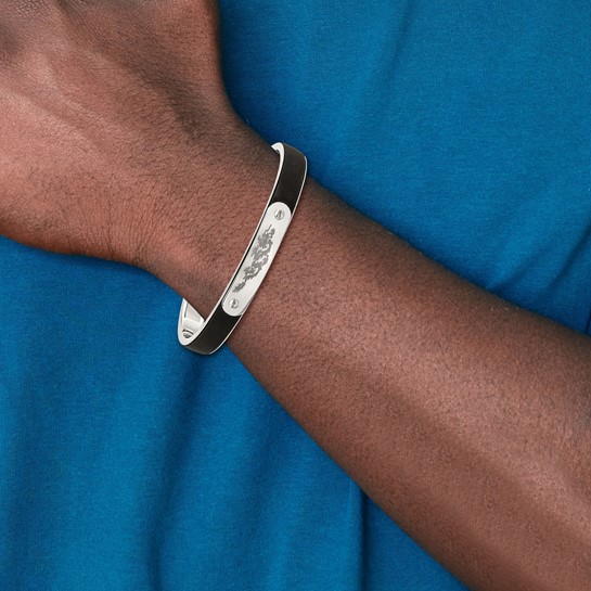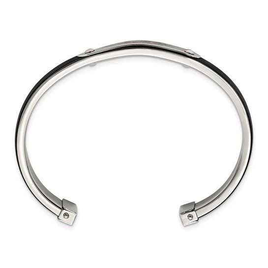 Dragon cuff bangle is made of black rubber and stainless steel. Polished finish. 3/8in wide bangle bracelet. Black rubber. This bracelet is composed of grade 316 stainless steel. Stainless steel will not oxidize [rust] nor turn black. Imported.