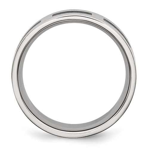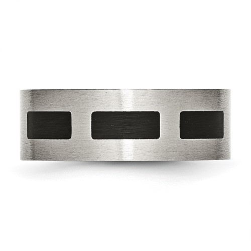 Band is 8mm wide. Flat center, brushed finish with black accents. Available in half and whole sizes, 6-13. This ring is composed of grade 316 stainless steel, known for its superior corrosion resistance. 316 steel is commonly used in stainless steel jewelry. Insist on 316 stainless steel. 316 steel is also known as marine grade stainless steel, for its high resistance to chloride corrosion. Stainless steel will not oxidize [rust] nor turn black. Imported.
