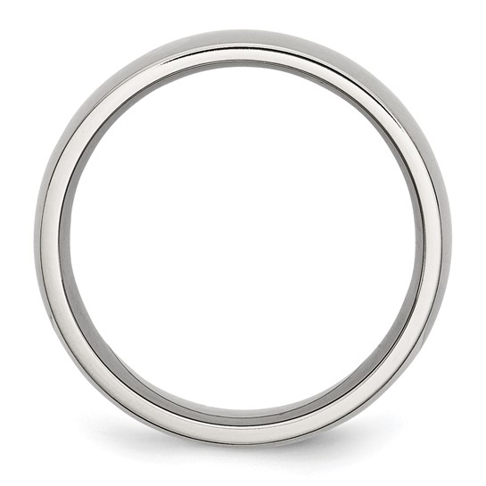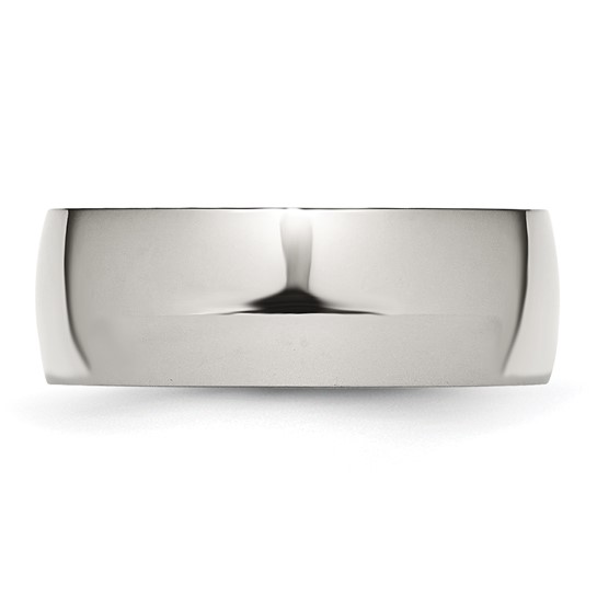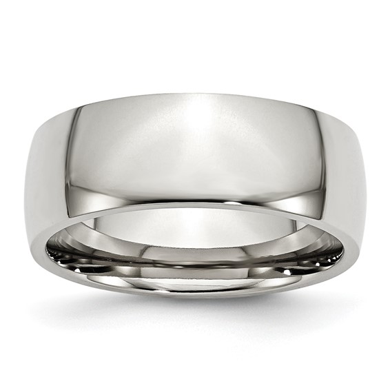 Band is 8mm wide. Domed center and polished finish. Comfort fit available in half and whole sizes, 6-13. This ring is composed of grade 316 stainless steel, known for its superior corrosion resistance. 316 steel is commonly used in stainless steel jewelry. Insist on 316 stainless steel. 316 steel is also known as marine grade stainless steel, for its high resistance to chloride corrosion. Stainless steel will not oxidize [rust] nor turn black. Imported.