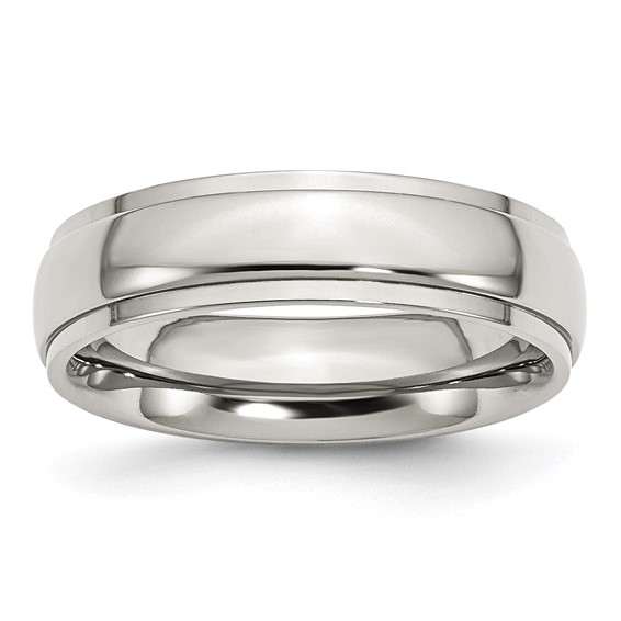 Band is 6mm wide. Domed center and ridged edges. Available in half and whole sizes, 6-13. This ring is composed of grade 316 stainless steel, known for its superior corrosion resistance. 316 steel is commonly used in stainless steel jewelry. Insist on 316 stainless steel. 316 steel is also known as marine grade stainless steel, for its high resistance to chloride corrosion. Stainless steel will not oxidize [rust] nor turn black. Imported.