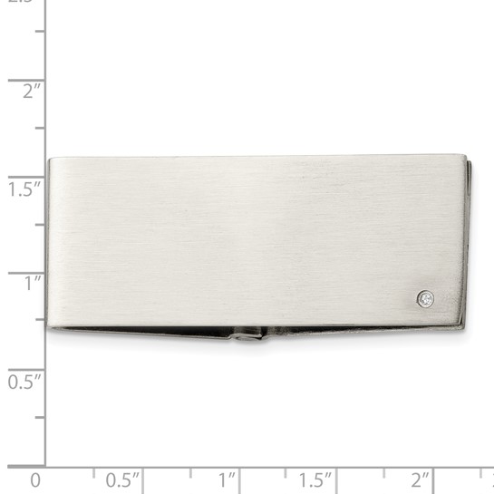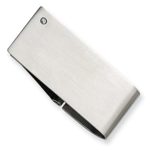 3.5pt full cut round diamond accent. Brushed finish. Hinged money clip dimensions: 2in x 7/8in. This money clip is composed of grade 316 stainless steel, known for its superior corrosion resistance. 316 steel is commonly used in stainless steel jewelry. Insist on 316 stainless steel. 316 steel is also known as marine grade stainless steel, for its high resistance to chloride corrosion. Stainless steel will not oxidize [rust] nor turn black. Imported.