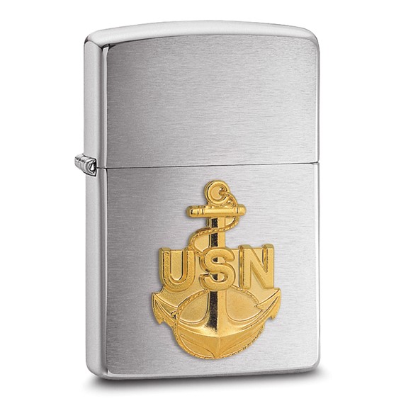 Brushed chrome Zippo lighter features a gold-tone United States navy anchor emblem. The original Zippo liquid fuel lighter is the world's best pocket lighter. Made in the USA by Zippo, the name in flame. Features flint ignition, the famous Zippo click, distinctive chimney patters, and the Zippo guarantee.