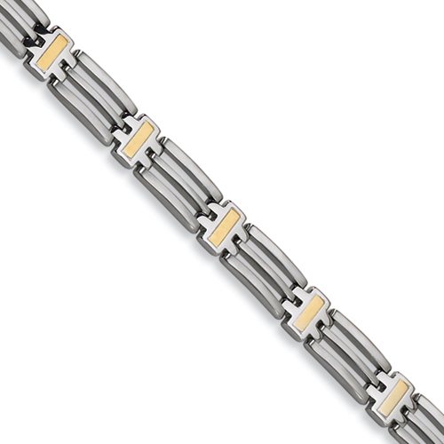 Stainless steel bracelet has polished 24k gold-plated links and brushed finish. 3/8in wide links, bracelet is 8 1/2 inches in length. This bracelet is composed of grade 316 stainless steel, known for its superior corrosion resistance. 316 steel is commonly used in stainless steel jewelry. Insist on 316 stainless steel. 316 stainless steel is also known as marine grade stainless steel, for its high resistance to chloride corrosion. Stainless steel will not oxidize [rust] nor turn black. Imported.