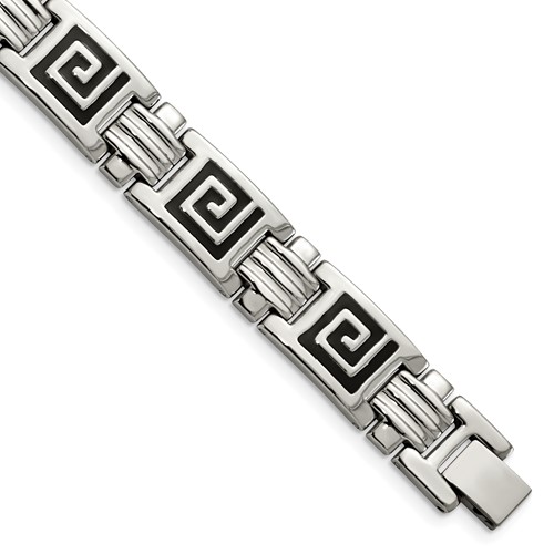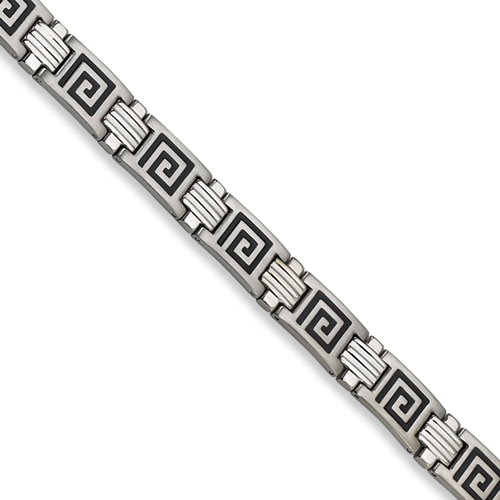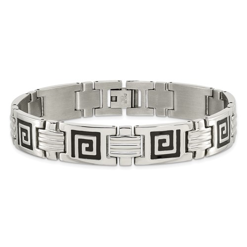 Enameled Greek key design. Brushed and polished finish. 3/8in wide links, bracelet is 9 inches in length. This bracelet is composed of grade 316 stainless steel, known for its superior corrosion resistance. 316 steel is commonly used in stainless steel jewelry. Insist on 316 stainless steel. 316 stainless steel is also known as marine grade stainless steel, for its high resistance to chloride corrosion. Stainless steel will not oxidize [rust] nor turn black. Imported.