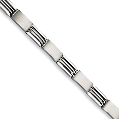 This men's stainless steel bracelet has rectangular links with open grooves. Brushed and polished finish. Fold-over clasp. 5/16in wide links, bracelet is 8 1/2 inches in length. This bracelet is composed of grade 316 stainless steel. Stainless steel will not oxidize [rust] nor turn black. Imported.