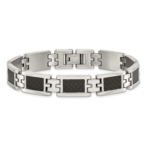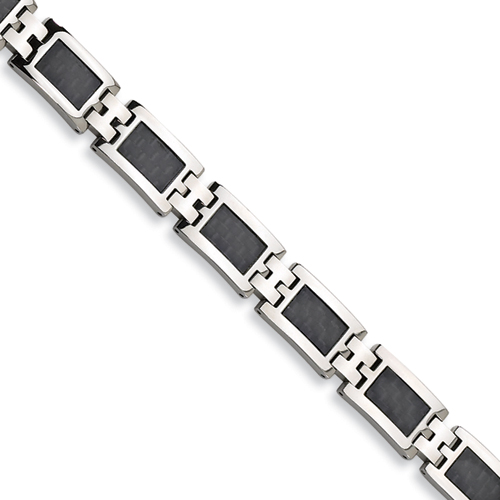 Black carbon fiber, polished finish. 1/2in wide links, bracelet is 9 1/4 inches in length. This bracelet is composed of grade 316 stainless steel, known for its superior corrosion resistance. 316 steel is commonly used in stainless steel jewelry. Insist on 316 stainless steel. 316 stainless steel is also known as marine grade stainless steel, for its high resistance to chloride corrosion. Stainless steel will not oxidize [rust] nor turn black. Imported.