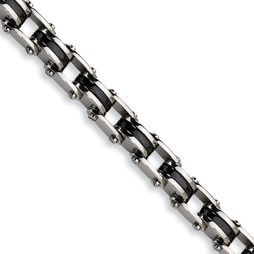 Black rubber, polished finish. 3/8in wide links, bracelet is 8 3/4 inches in length. This bracelet is composed of grade 316 stainless steel, known for its superior corrosion resistance. 316 steel is commonly used in stainless steel jewelry. Insist on 316 stainless steel. 316 stainless steel is also known as marine grade stainless steel, for its high resistance to chloride corrosion. Stainless steel will not oxidize [rust] nor turn black. Imported.
