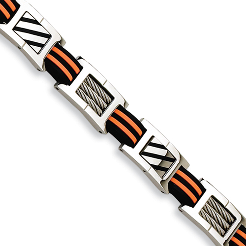 Black and orange rubber links, polished finish. 1/2in wide links, bracelet is 8 1/2 inches in length. This bracelet is composed of grade 316 stainless steel, known for its superior corrosion resistance. 316 steel is commonly used in stainless steel jewelry. Insist on 316 stainless steel. 316 stainless steel is also known as marine grade stainless steel, for its high resistance to chloride corrosion. Stainless steel will not oxidize [rust] nor turn black. Imported.