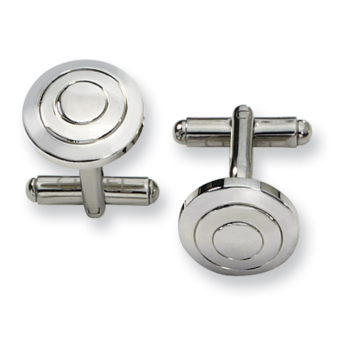 Stainless steel cuff links have concentric circle designs with a polished finish. Round cuff links are 5/8in in diameter. This item is composed of grade 316 stainless steel. Stainless steel will not oxidize [rust] nor turn black. Imported.