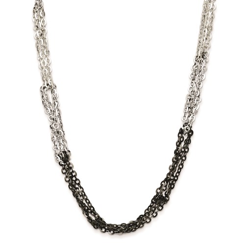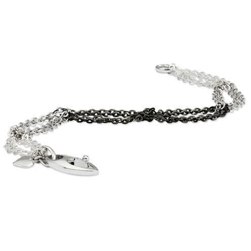 Three tone silver bracelet has cascading white, silver and black strands. 7 1/2in bracelet with push lock clasp. Made in Italy. Weight: 6.2 grams. Black rhodium, rhodium, and ruthenium plating.