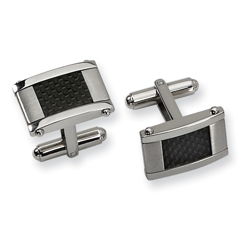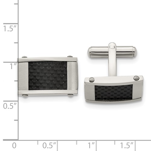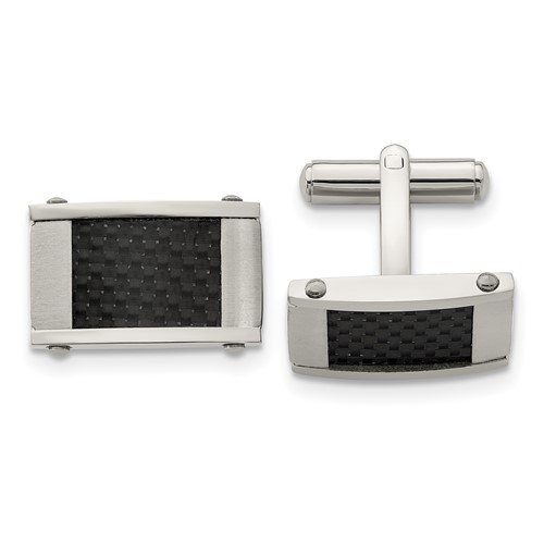 Stainless steel cufflinks feature black carbon fiber. Brushed and polished finish. Cuff links are 3/4in x 7/16in. This item is composed of grade 316 stainless steel, known for its superior corrosion resistance. 316 steel is commonly used in stainless steel jewelry. Insist on 316 stainless steel. 316 steel is also known as marine grade stainless steel, for its high resistance to chloride corrosion. Stainless steel will not oxidize [rust] nor turn black. Imported.