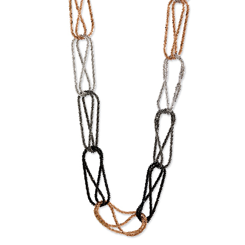 Four tone silver necklace has pink, white, silver and black strands. 28in necklace has a lobster clasp. Made in Italy. Weight: 18.4 grams. Pink flash-plated, black rhodium, rhodium, and ruthenium plating.