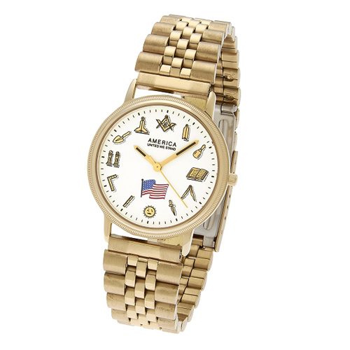 Masonic watch has a 36mm stainless steel bezel, yellow gold toned with Masonic symbols denoting hour marks. Fold-over stainless steel bracelet, gold tone. Fine quartz Swiss ETA movement, white round face. Sapphire crystal. Limited 1 year warranty. Manufactured by Dason-Reis.