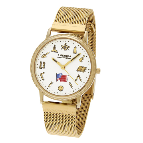 Masonic watch has a round 36mm stainless steel bezel, yellow gold toned with Masonic symbols denoting hour marks. Gold tone mesh bracelet. Fine quartz Swiss ETA movement, white round dial. Sapphire crystal. Manufactured by Dason-Reis.