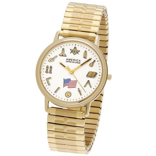 Masonic watch has a 36mm yellow gold stainless steel case toned with Masonic symbols denoting hour marks. Expansion gold-tone stainless steel band. Fine quartz Swiss ETA movement, white round face. Sapphire crystal. Limited 1 year warranty. Manufactured by Dason-Reis.