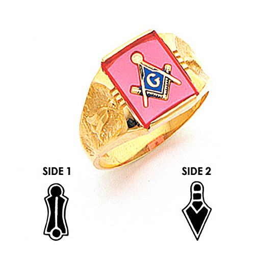 Open or solid back, polished 10k yellow gold ring with Masonic compass and set square symbol. Plumb bob and trowel side emblems. Choose red, blue or onyx rectangular stone. Standard fit. Made in USA.