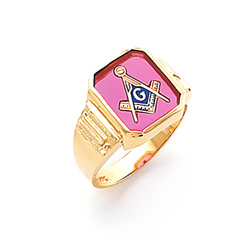 Polished 14k yellow gold masonic ring has an octagonal stone with tapered sides and thin plumb bob and trowel side emblems. Also available in white gold by special order. Choose red, blue or onyx octagonal stone. Solid or open back. Made in the USA.