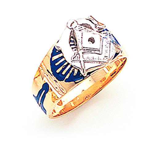 Solid back, polished 10k yellow gold ring with Masonic compass and set square symbol. Blue enamel plumb bob and trowel side emblems. Ring accommodates up to a 10pt diamond. Diamond not included.