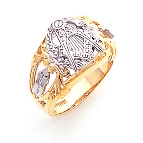 Open back, polished 10kt two-tone gold ring with Masonic compass and set square symbol. Scroll design with cut-out shank. White gold plumb bob and trowel side emblems. Made in the USA.