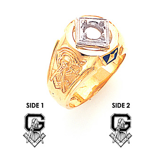 Open back, polished 14k yellow gold ring. Signet style top. Masonic side emblems. Ring accommodates up to a 3/4 ct tw diamond. Diamond not included.