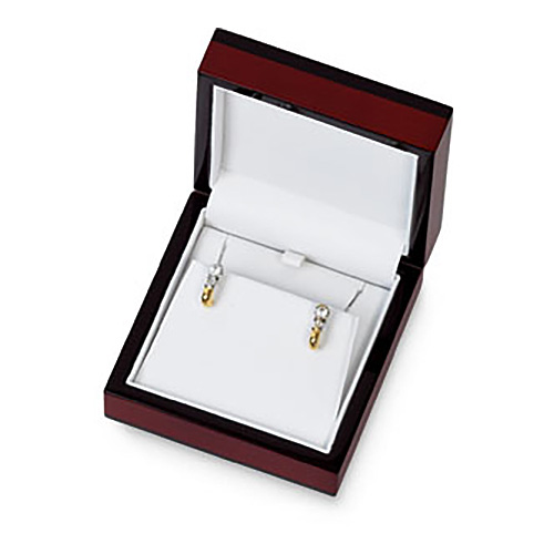 The large square maple wood earring or pendant box has a high-gloss cherry finish. Trimmed with black ebonized trim and white leatherette interior. Black, 2-piece outer carton included. Item dimensions: 89mm (w) x 92mm (l) x 40mm (h). 3 1/2in x 3 5/8in x 1 1/2in. Weighs approximately 5.5oz.