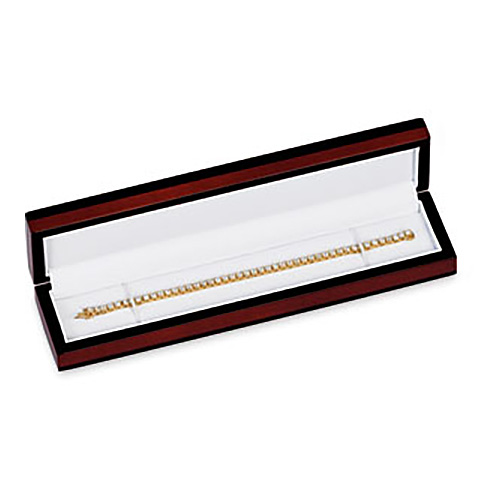 This maple wood layout bracelet box has a high-gloss cherry finish. Black ebonized trim and white leatherette interior. Black, 2-piece outer carton included. Item dimensions: 219mm (w) x 51mm (l) x 32mm (h). 8 5/8in x 2in x 1 1/4in. Weighs approximately 6.6oz.