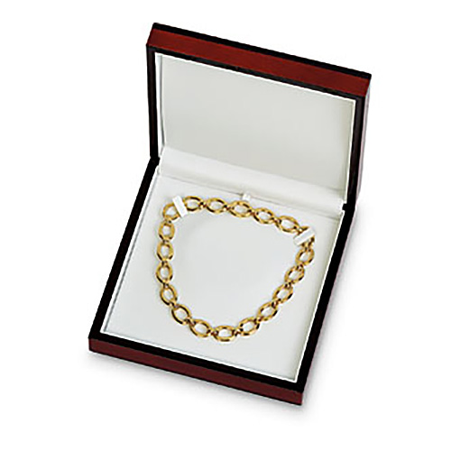 This maple wood necklace box has a high-gloss cherry finish with black ebonized trim and white leatherette interior. Black, 2-piece outer carton included. Item dimensions: 200mm (w) x 200mm (l) x 51mm (h). 7 7/8in x 7 7/8in x 2in. Weighs approximately 24.9 oz.
