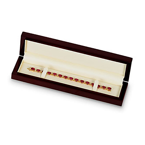 The burgundy lacquered beechwood layout bracelet box has a soft-cream, leatherette interior. Burgundy - wood tone, 2-piece outer carton included. Item dimensions: 235mm (w) x 60mm (l) x 29mm (h). 9 1/4in x 2 3/8in x 1 1/8in. Weighs approximately 10 oz.