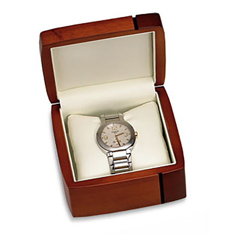 This watch box is made of oak wood with high-gloss finish and beige leatherette interior. Matching, 2-piece outer carton included. Item dimensions: 115mm (w) x 115mm (l) x 64mm (h). 4 1/2in x 4 1/2in x 2 1/2in. Weighs approximately 9.37 oz.