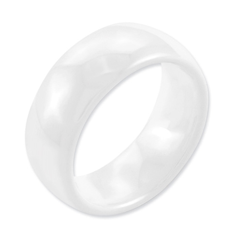 White ceramic ring is 8mm wide and features a domed center. Hypo-allergenic. Guaranteed to retain its high polish, this ring is highly scratch resistant. Comfort fit available in half and whole sizes, 5-9. Our customers may exchange this ring as many times as needed for the lifetime of the ring for a different size. $20 deductible will apply. Imported.
