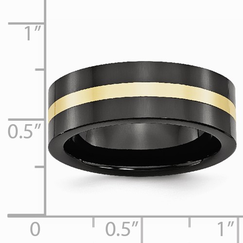 Band is 8mm wide. Polished finish, 14k yellow gold inlay with flat center. Hypo-allergenic. Guaranteed to retain its high polish, this ring is highly scratch resistant. Comfort fit available in half and whole sizes, 8-13. Our customers may exchange this ring as many times as needed for the lifetime of the ring for a different size. $20 deductible will apply. Imported.