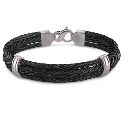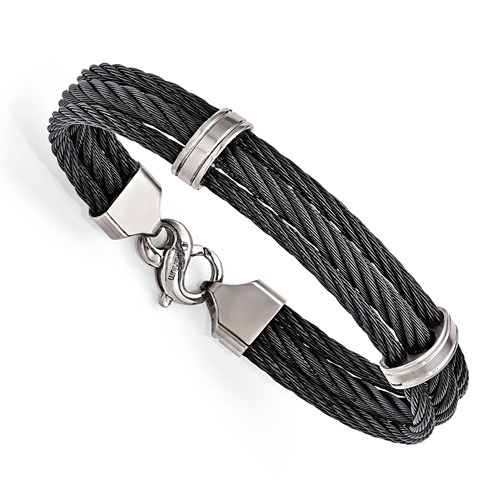 Black and gray titanium bracelet features three cables and a sturdy gray titanium lobster clasp. WIdth: 11mm; length: 8in. This bracelet is 100% hypo-allergenic. Made in the USA by Edward Mirell, the leader in contemporary men's jewelry.BLACK-Ti - an exclusive and patented product developed by Spectore Corporation. The black is not an applied coating, it results from a unique combination of process and alloy integrated into the metal. A heat process actually turns the titanium black from the outside in. It is exceptionally hard, scratch resistant, impossible to chip and impervious to all chemistry (with theexception of Hydrofluoric acid).GRAY TITANIUM - All products in the Edward Mirell gray titanium collection are precision crafted in 99% commercially pure Spectore brand™ Titanium, a hypo-allergenic bio-compatible element. This material is the perfect combination of strength, durability and safety. Pure Titanium maintains the hardness and toughness to withstand a lifetime of punishment, yet can be safely cut and removed in the event of an emergency.BLACK MEMORY CABLE - Spectore's black cable is crafted with 12 very fine strands of memory metal used extensively throughout the medical industry due to its perfect bio-compatibility. In addition to its rich stylish look, this material provides extreme durability and a remarkable ability to retain its intended profile.