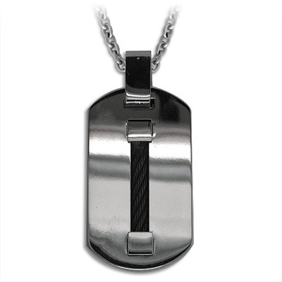 Edward Mirell men's black and gray titanium dog tag includes a 20in rolo chain with claw clasp. Pendant size: 1 5/8in x 11/16in. This necklace is 100% hypo-allergenic. Made in the USA by Edward Mirell, the leader in contemporary men's jewelry.