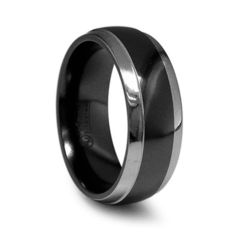 This Edward Mirell ring has a raised black titanium center and gray edges. Width: 8mm. This item is 100% hypo-allergenic. Available while supplies last in select sizes. Made in the USA.BLACK-Ti - an exclusive and patented product developed by Spectore Corporation. The black is not an applied coating, it results from a unique combination of process and alloy integrated into the metal. A heat process actually turns the titanium black from the outside in. It is exceptionally hard, scratch resistant, impossible to chip and impervious to all chemistry (with the exception of Hydrofluoric acid).GRAY TITANIUM - All products in the Edward Mirell gray titanium collection are precision crafted in 99% commercially pure Spectore brand™ Titanium, a hypo-allergenic bio-compatible element. This material is the perfect combination of strength, durability and safety. Pure Titanium maintains the hardness and toughness to withstand a lifetime of punishment, yet can be safely cut and removed in the event of an emergency.