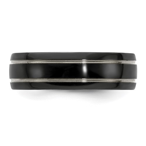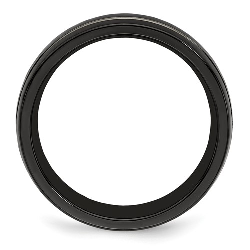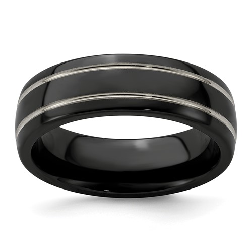 This Edward Mirell black titanium ring has two gray titanium grooves and flat edges. Width: 7mm. This item is 100% hypo-allergenic. Available while supplies last. Made in the USA by Edward Mirell, the leader in contemporary men's jewelry.BLACK-Ti - an exclusive and patented product developed by Spectore Corporation. The black is not an applied coating, it results from a unique combination of process and alloy integrated into the metal. A heat process actually turns the titanium black from the outside in. It is exceptionally hard, scratch resistant, impossible to chip and impervious to all chemistry (with the exception of Hydrofluoric acid).GRAY TITANIUM - All products in the Edward Mirell gray titanium collection are precision crafted in 99% commercially pure Spectore brand™ Titanium, a hypo-allergenic bio-compatible element. This material is the perfect combination of strength, durability and safety. Pure Titanium maintains the hardness and toughness to withstand a lifetime of punishment, yet can be safely cut and removed in the event of an emergency.