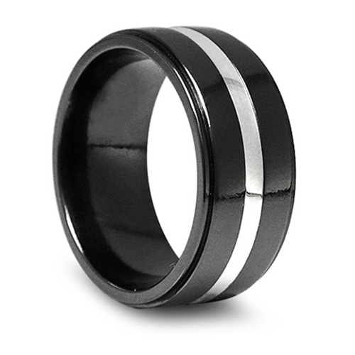 This extra wide black titanium ring has a flat center and sterling silver inlay. High polish finish, width: 10mm. This item is 100% hypo-allergenic. Made in the USA by Edward Mirell, the leader in contemporary men's jewelry.BLACK-Ti - an exclusive and patented product developed by Spectore Corporation. The black is not an applied coating, it results from a unique combination of process and alloy integrated into the metal. A heat process actually turns the titanium black from the outside in. It is exceptionally hard, scratch resistant, impossible to chip and impervious to all chemistry (with the exception of Hydrofluoric acid).