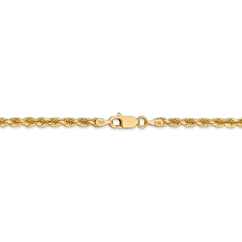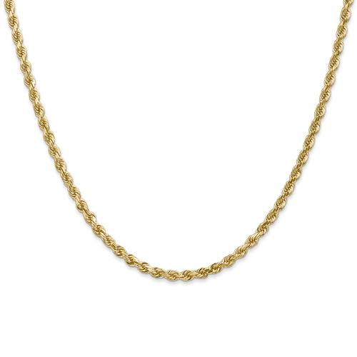 Diamond-cut solid 14k yellow rope gold chain has a lobster clasp. Length: 20 inches. Width: 3mm. This solid 14k yellow gold rope chain is hand made. Weighs 15.85 grams. Please note: weight is approximate, actual weight may vary. Made in Peru.