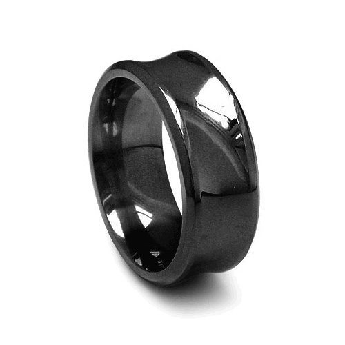 Black titanium ring has a concave center. Made in the USA by Edward Mirell. Width: 9mm. BLACK-Ti - an exclusive and patented product developed by Spectore Corporation. The black is not an applied coating, it results from a unique combination of process and alloy integrated into the metal. A heat process actually turns the titanium black from the outside in. It is exceptionally hard, scratch resistant, impossible to chip and impervious to all chemistry (with the exception of Hydrofluoric acid).