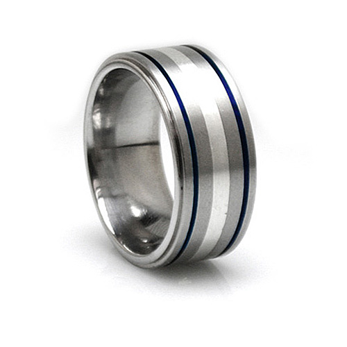Gray titanium ring boasts a sterling silver inlay and anodized grooves. Flat center. Made in the USA by Edward Mirell, the leader in contemporary men's jewelry.GRAY TITANIUM - All products in the Edward Mirell gray titanium collection are precision crafted in 99% commercially pure Spectore brand™ Titanium, a hypo-allergenic bio-compatible element. This material is the perfect combination of strength, durability and safety. Pure Titanium maintains the hardness and toughness to withstand a lifetime of punishment, yet can be safely cut and removed in the event of an emergency.