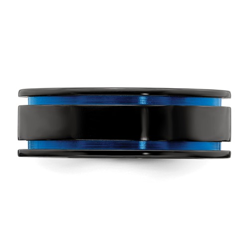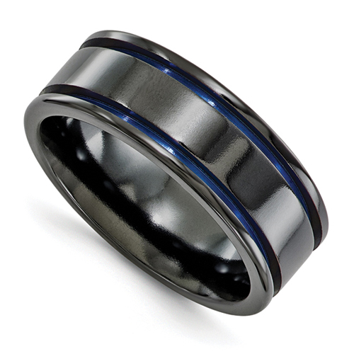 Black titanium ring features two blue anodized grooves. Polished finish, ring width: 8mm. Available in select sizes while supplies last. Made in the USA by Edward Mirell, the leader in contemporary men's jewelry.BLACK-Ti - an exclusive and patented product developed by Spectore Corporation. The black is not an applied coating, it results from a unique combination of process and alloy integrated into the metal. A heat process actually turns the titanium black from the outside in. It is exceptionally hard, scratch resistant, impossible to chip and impervious to all chemistry (with the exception of Hydrofluoric acid).