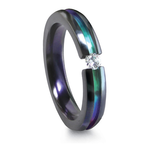 Black titanium ring features a multi-colored anodized groove and a tension-set 1/7 CT TW round brilliant white sapphire. Polished finish, ring width: 4mm. Available in finger sizes 5-13, whole and half sizes only. Made in the USA by Edward Mirell, the leader in contemporary men's jewelry.