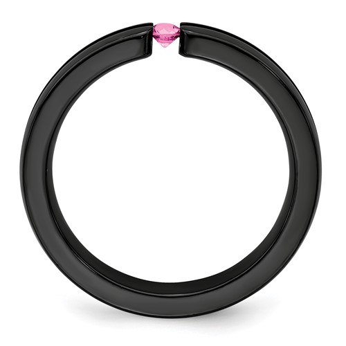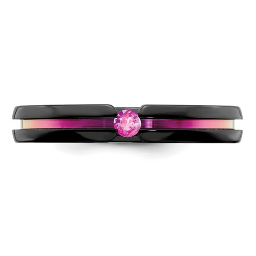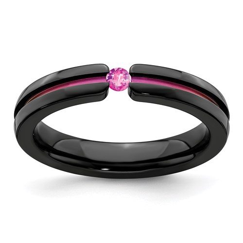 Black titanium ring features a pink anodized groove and a tension-set 3mm round brilliant pink sapphire. Polished finish, ring width: 4mm. Available in finger sizes 5-13, whole and half sizes only. Made in the USA by Edward Mirell, the leader in contemporary men's jewelry.BLACK-Ti - an exclusive and patented product developed by Spectore Corporation. The black is not an applied coating, it results from a unique combination of process and alloy integrated into the metal. A heat process actually turns the titanium black from the outside in. It is exceptionally hard, scratch resistant, impossible to chip and impervious to all chemistry (with the exception of Hydrofluoric acid).GRAY TITANIUM - All products in the Edward Mirell gray titanium collection are precision crafted in 99% commercially pure Spectore brand™ Titanium, a hypo-allergenic bio-compatible element. This material is the perfect combination of strength, durability and safety. Pure Titanium maintains the hardness and toughness to withstand a lifetime of punishment, yet can be safely cut and removed in the event of an emergency.