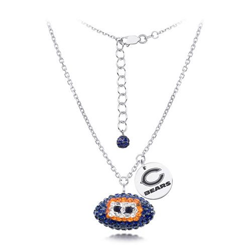 Chicago Bears crystal football necklace features blue, orange and white Austrian crystals. Sterling silver 18in diamond cut cable chain and lobster clasp. Football dimensions: 17mm, slightly smaller than a dime. Officially licensed.