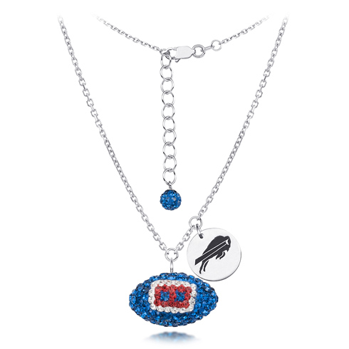 Buffalo Bills crystal football necklace features royal blue, red and white Austrian crystals. Sterling silver 18in diamond cut cable chain and lobster clasp. Football dimensions: 17mm, slightly smaller than a dime. Officially licensed.