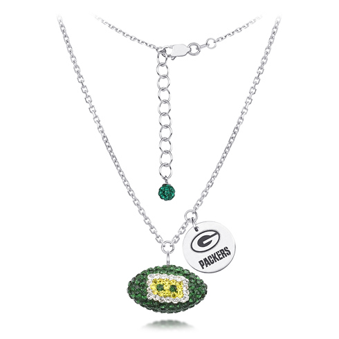 Green Bay Packers crystal football necklace features green, gold and white Austrian crystals. Sterling silver 18in diamond cut cable chain and lobster clasp. Football dimensions: 17mm, slightly smaller than a dime. Officially licensed.