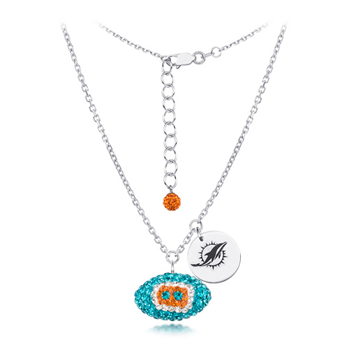 Miami Dolphins crystal football necklace features aqua green, orange and white Austrian crystals. Sterling silver 18in diamond cut cable chain and lobster clasp. Football dimensions: 17mm, slightly smaller than a dime. Officially licensed.