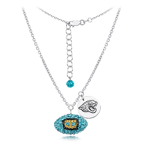 Jacksonville Jaguars crystal football necklace features teal, black and gold Austrian crystals. Sterling silver 18in diamond cut cable chain and lobster clasp. Football dimensions: 17mm, slightly smaller than a dime. Officially licensed.