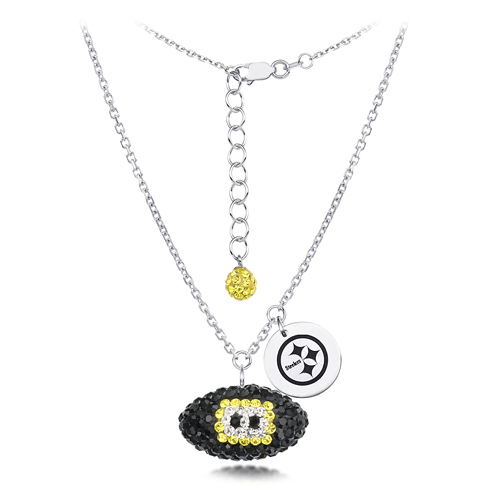 Pittsburgh Steelers crystal football necklace features black, gold and white Austrian crystals. Sterling silver 18in diamond cut cable chain and lobster clasp. Football dimensions: 17mm, slightly smaller than a dime. Officially licensed.